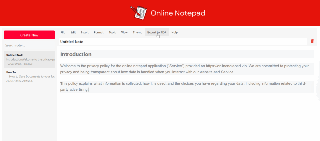 It is very possible to save your drafted notes or work to your local computer device or as PDF File. To perform this task, navigate your mouse to ‘Export to PDF’ on the menu bar and click on it. Your note file will be converted to PDF and Download to your Computer Downloads Folder’.