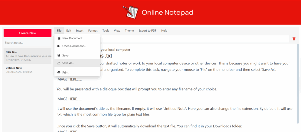It is very possible to save your drafted notes or work to your local computer device or other devices. This is because you might want to have your important documents or drafts organised. To complete this task, navigate your mouse to ‘File’ on the menu bar and then select ‘Save As’.