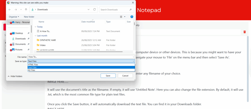 After following the process above, you then click the Save button to store the file in your chosen folder on your computer. It will save the text file. You can find the saved file in your Downloads folder, or any other folder you have chosen.